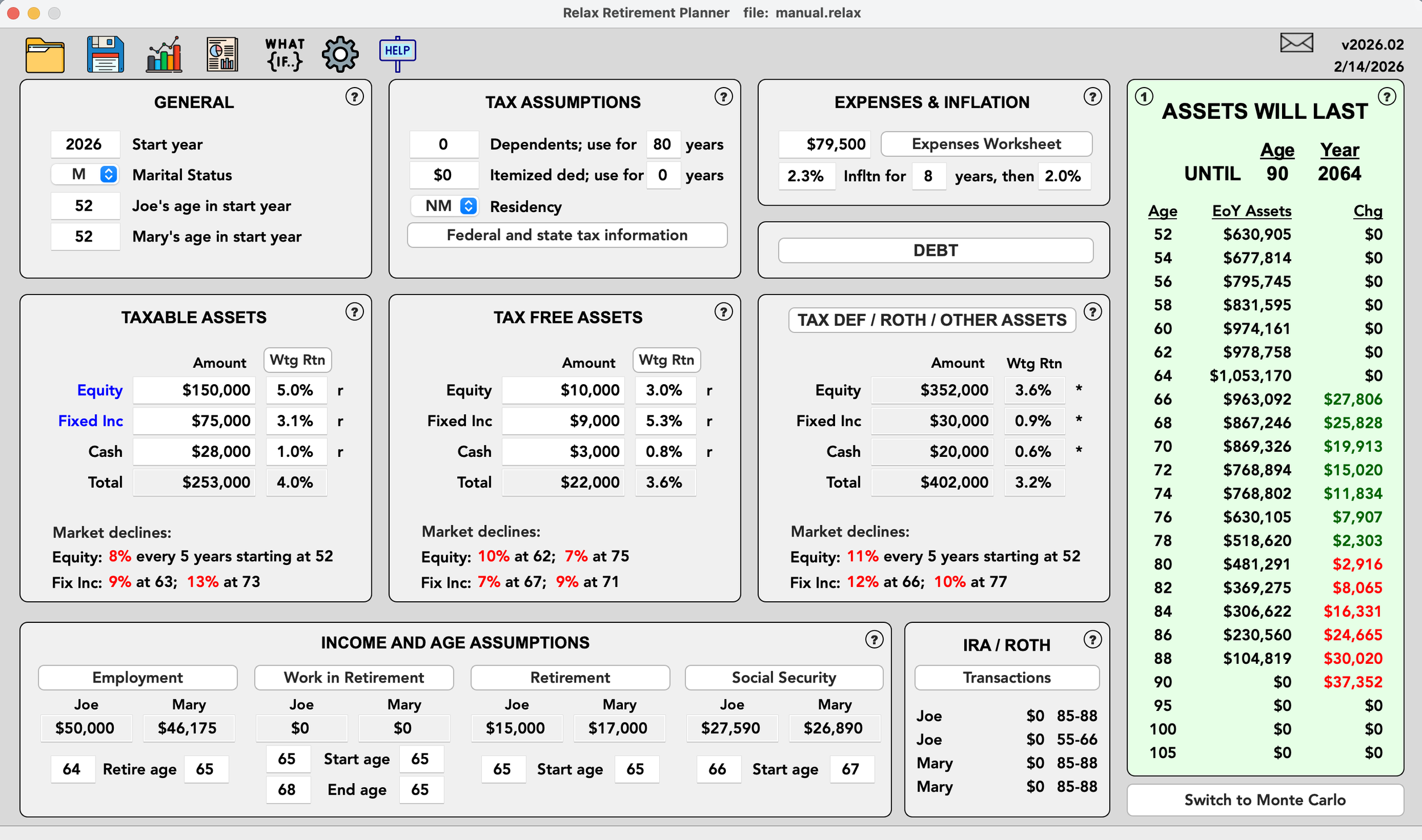 I found this tool to be very easy to use. It takes into consideration all of the pertinent factors and does all of the legwork for you. I love that it factors in what state you live in and allows you to decide when you plan to take social security, since these things matter. Then, it gives you a clear, concise answer to the question we are all asking “How long will my money last”. No more guessing. The Relax retirement planner is well worth the money, as I can plan my financial life with much more accuracy than ever before.
